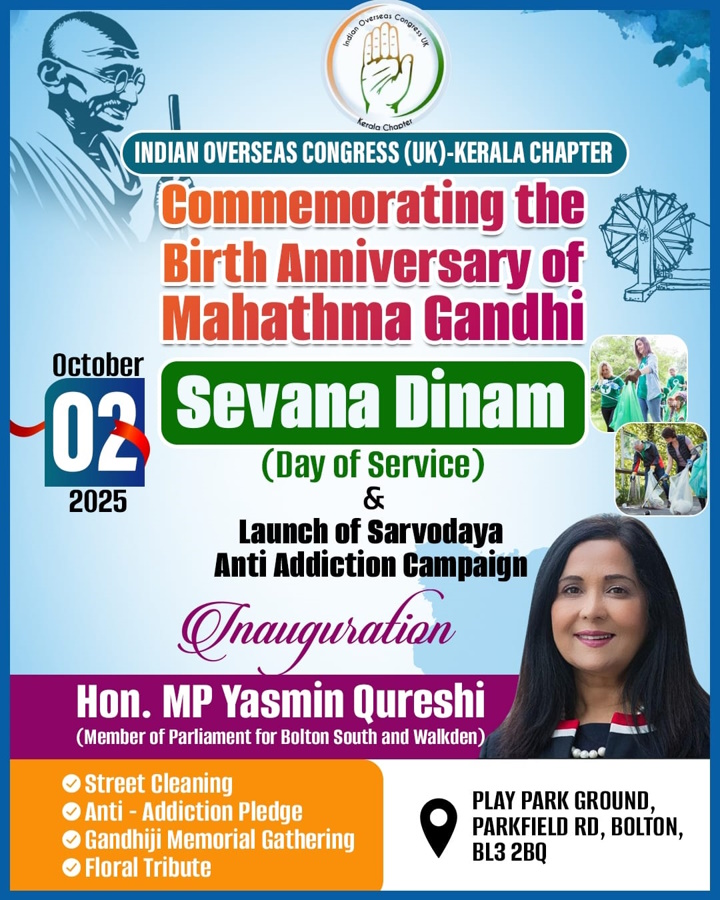 ഐ ഒ സി (യു കെ) – കേരള ചാപ്റ്റർ മിഡ്ലാൻഡ്സ് ഏരിയയുടെ നേതൃത്വത്തിൽ ഗാന്ധി ജയന്തി ദിനത്തിൽ തെരുവ് ശുചീകരണം നടത്തും. അന്നേ ദിവസം ‘സേവന ദിന’മായി ആചരിക്കുന്നതിന്റെ ഭാഗമായി ഐ ഓ സി പ്രവർത്തകർ ബോൾട്ടനിലെ ‘പ്ലേ പാർക്ക്’ പ്ലേ ഗ്രൗണ്ട് ശുചീകരിക്കും.