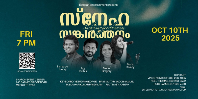 ഡാളസ്/മെസ്കിറ്റ്: സ്വർഗ്ഗീയ സംഗീതത്തിൻ്റെ മാസ്മരികത ഉയർത്തി കൊണ്ട് ക്രിസ്തീയ ഗായകനും ഐഡിയ സ്റ്റാർ സിംഗർ താരവുമായ ഇമ്മാനുവേൽ ഹെൻറിയും സംഘവും ഡാളസ് പട്ടണത്തിൽ ഈ സെപ്റ്റംബറിൽ സംഗീത സന്ധ്യയുമായി എത്തുകയാണ്. ഇമ്മാനുവേൽ ഹെൻറിയോടൊപ്പം, പ്രശസ്ത ഗായകരായ റോയ് പുത്തൂർ, മെറിൻ ഗ്രിഗറി, മരിയ കോലടി എന്നിവരും പങ്കെടുക്കുന്നുണ്ട്. അമേരിക്കൻ ഐക്യനാടുകളിലെ പര്യടനത്തിനെത്തുന്നതിൻ്റെ ഭാഗമായാണ് സ്നേഹസങ്കീർത്തനം ടീം, പ്രമുഖ സിറ്റിയായ ഡാളസ്സിലും പരിപാടി സംഘടിപ്പിക്കുന്നത്.