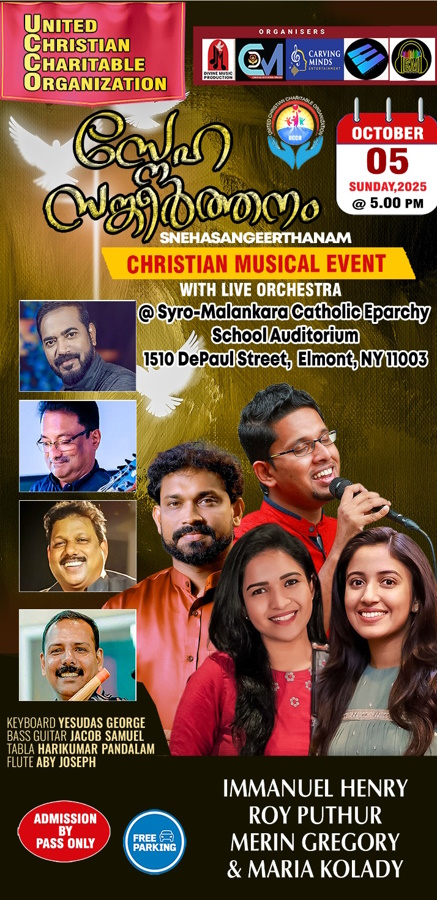 “സ്നേഹ സങ്കീർത്തനം” എന്ന ഈ സംഗീത നിശ എൽമൻഡിലുള്ള മലങ്കര കാത്തോലിക് സ്കൂൾ ഓഡിറ്റോറിയത്തിൽ (1510 DePaul St, Elmont, NY) വച്ചാണ് നടത്തപ്പെടുന്നത്. ഗായകരായ ഇമ്മാനുവൽ ഹെൻറി, റോയി പുത്തൂർ, മെറിൻ ഗിഗ്രറി, മരിയ കോലടി കൂടാതെ കേരളത്തിൽ അറിയപ്പെടുന്ന ഓർക്കസ്ട്ര ടീം ഈ മ്യൂസിക്കൽ ഈവൻ്റ് മികവുറ്റതാക്കും. വ്യത്യസ്ത നിറഞ്ഞ ഈ ഗാന സദ്യയിലേക്ക് ഏവരെയും സ്വാഗതം ചെയ്യുന്നു.