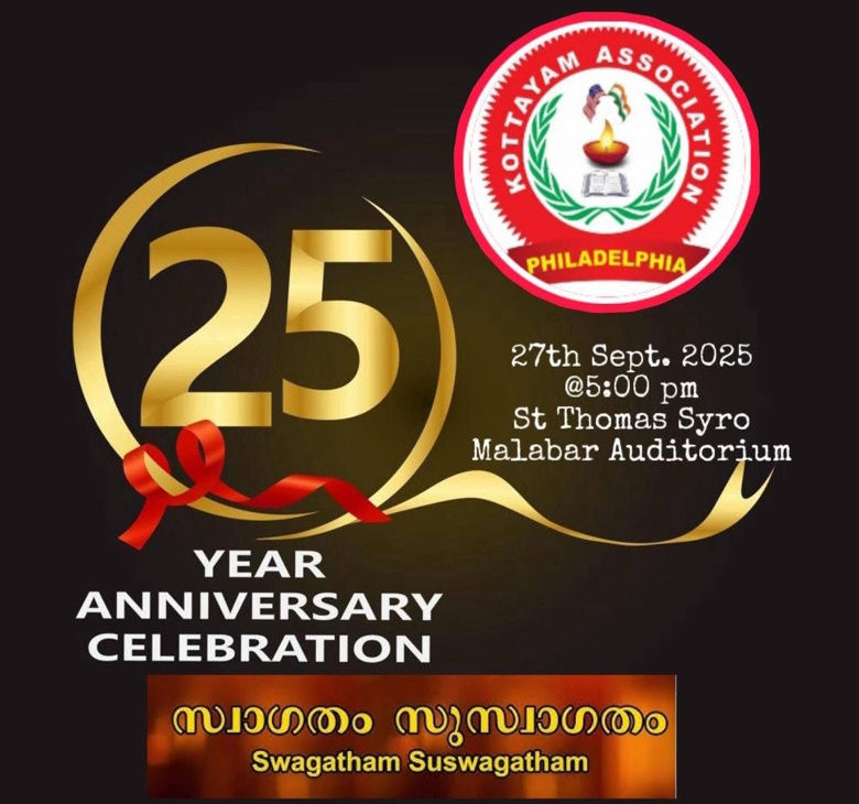 ഫിലഡല്ഫിയ: ഫിലഡല്ഫിയയിലും പരിസരപ്രദേശങ്ങളിലുമായി താമസിക്കുന്ന കോട്ടയം സ്വദേശികളുടെ സംഘടനയായ ഫിലഡല്ഫിയ കോട്ടയം അസോസിയേഷന്റെ സില്വര് ജൂബിലി ആഘോഷങ്ങളുടെ ഭാഗമായി സെപ്തംബര് 27 ശനിയാഴ്ച വൈകിട്ട് 5:30 നു വെല്ഷ് റോഡിലുള്ള സെന്റ് തോമസ് സീറോ മലബാര് ചര്ച്ച് ഓഡിറ്റോറിയത്തില് വച്ച് നടത്തപ്പെടുന്ന ജൂബിലി ബാങ്ക്വറ്റിനുള്ള ഒരുക്കങ്ങള് എല്ലാം പൂര്ത്തിയായതായി ഭാരവാഹികള് അറിയിച്ചു. ചാരിറ്റി പ്രവര്ത്തനം മുഖമുദ്രയാക്കിയ സംഘടന നിരവധി കാരുണ്യ പ്രവര്ത്തനങ്ങള് അമേരിക്കയിലും കേരളത്തിലും തുടര്ച്ചയായി നടത്തി വരുന്നു.