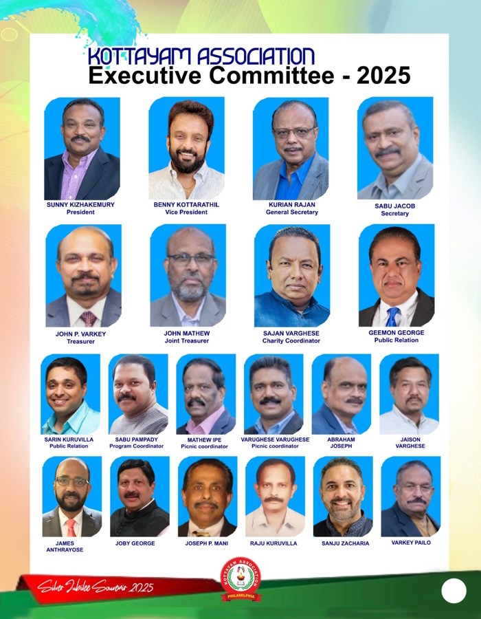 കോട്ടയം അസോസിയേഷന് ഫിലഡല്ഫിയയുടെ നടപ്പു വര്ഷത്തെ ഭാരവാഹികളായ സണ്ണി കിഴക്കേമുറിയില് (പ്രസിഡന്റ്), ജോബി ജോര്ജ് (ജൂബിലി കണ്വീനര്) എന്നിവര് നേതൃത്വം നല്കുന്ന വിവിധ കമ്മിറ്റികളില് ബെന്നി കൊട്ടാരത്തില്, കുര്യന് രാജന്, സാബു ജേക്കബ്, ജോണ് പി. വര്ക്കി, ജീമോന് ജോര്ജ്, സാജന് വര്ഗീസ്, ജോസഫ് മാണി, മാത്യു ഐപ്, വറുഗീസ് വറുഗീസ്, സാബു പാമ്പാടി, ജെയിംസ് അന്ത്രയോസ്, ജോണ് മാത്യു, രാജു കുരുവിള, എബ്രഹാം ജോസഫ്, വര്ക്കി പൈലോ, സരിന് ചെറിയാന് കുരുവിള, സഞ്ജു സക്കറിയ, ജെയ്സണ് വര്ഗീസ്, ജോഷ്വാ മാത്യു എന്നിവരും പ്രവര്ത്തിക്കുന്നു.