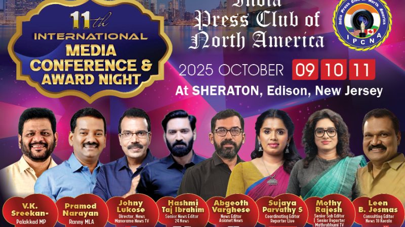 ഇന്ത്യാ പ്രസ് ക്ലബ് ഓഫ് നോര്ത്ത് അമേരിക്കയുടെ പതിനൊന്നാമത് അന്തര്ദേശീയ മീഡിയാ കോണ്ഫറന്സ് ഒക്ടോബോര് 9, 10, 11 തീയ്യതികളില് ന്യൂജേഴ്സി-എഡിസണ് ഷെറാട്ടണ് ഹോട്ടൽ സമുച്ചയത്തിൽ അരങ്ങേറുകയാണ്. കേരളത്തില് നിന്നും, അമേരിക്കയില് നിന്നുമുള്ള പ്രമുഖ, മാധ്യമ, കലാ, സാംസ്ക്കാരിക, സാമൂഹ്യ വ്യക്തികള് പങ്കെടുക്കുന്ന ഈ കോണ്ഫറന്സ് അമേരിക്കന് മലയാളികള്ക്ക് അവിസ്മരണീയമായ ഒരനുഭവം ആയിരിക്കുമെന്ന് പ്രസിഡന്റ് സുനില് ട്രൈസ്റ്റാര്, സെക്രട്ടറി ഷിജോ പൗലോസ്, ട്രഷറാര് വിശാഖ് ചെറിയാന്, അഡ്വൈസറി ബോർഡ് ചെയർമാൻ സുനിൽ തൈമറ്റം, നിയുക്ത പ്രസിഡന്റ് രാജു പള്ളത്, വൈസ് പ്രസിഡന്റ് അനിൽ ആറന്മുള, ജോയിന്റ് സെക്രട്ടറി ആശ മാത്യു, ജോയിന്റ് ട്രെഷറർ റോയ് മുളകുന്നം, കോൺഫറന്സ് ചെയര്മാന് സജി എബ്രഹാം, ഹോസ്റ്റിങ് ചാപ്റ്റർ ന്യൂ യോർക്ക് പ്രസിഡന്റ് ഷോളി കുമ്പിളുവേലിൽ എന്നിവര് അറിയിക്കുന്നു. ഇതിനായുള്ള ഒരുക്കങ്ങള് ധൃതഗതിയില് സമയബന്ധിതമായി പുരോഗമിക്കുന്നു.
