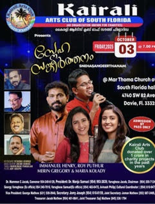 കഴിഞ്ഞ വർഷങ്ങളിൽ ഒരു കോടിയിലധികം രൂപ ജീവകാരുണ്യ പ്രവർത്തനങ്ങൾക്ക് സംഭാവന ചെയ്ത് പ്രസിദ്ധിയാര്ജിച്ച കൈരളി ആർട്സ് ക്ലബ് ഓഫ് സൗത്ത് ഫ്ലോറിഡയാണ് ഈ പ്രോഗ്രാം സംഘടിപ്പിക്കുന്നത്.