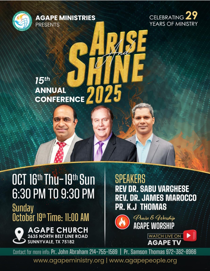 സണ്ണിവെയ്ൽ (ഡാലസ്) : ക്രിസ്തീയ ആത്മീയതക്കും നവീകരണത്തിനുമായി അമേരിക്കയിലെ അഗാപെ മിനിസ്ട്രീസ് സംഘടിപ്പിക്കുന്ന 15-ാമത് വാർഷിക സമ്മേളനം “അറൈസ് ആൻഡ് ഷൈൻ 2025” ഒക്ടോബർ 16 മുതൽ 19 വരെ സണ്ണിവേലിലെ അഗാപെ ചർച്ചിൽ നടക്കും.