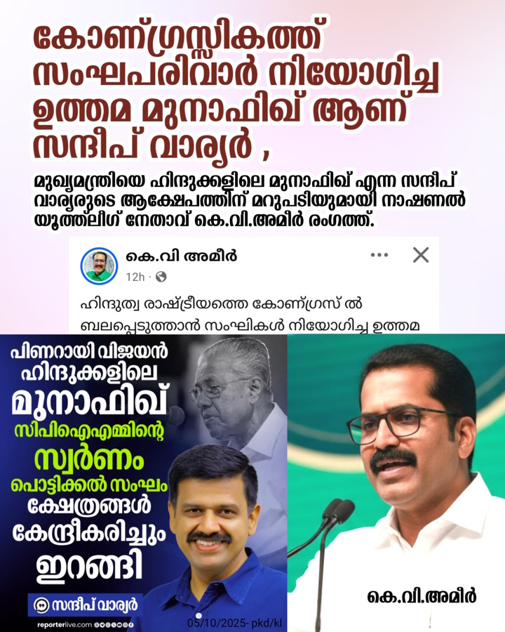പാലക്കാട്: കോണ്ഗ്രസ് വക്താവും മുൻ ബിജെപി നേതാവുമായ സന്ദീപ് വാര്യർ മുഖ്യമന്ത്രിക്കെതിരെ ഉയർത്തിയ ‘ഹിന്ദുക്കളിലെ മുനാഫിഖ്’ എന്ന അധിക്ഷേപ പരാമർശത്തിന് മറുപടിയുമായി ഐ എൻ എൽ യുവജന വിഭാഗം നേതാവ് കെ.വി.അമീർ.