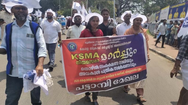 തിരുവനന്തപുരം: തൊഴിൽ സംരക്ഷണം ഉറപ്പാക്കുക, പാഴ് വസ്തുക്കളെ നികുതിയിൽ നിന്നും പൂർണമായും ഒഴിവാക്കുക തുടങ്ങി വിവിധ ആവശ്യങ്ങൾ ഉന്നയിച്ച് സംസ്ഥാനത്തെ ഖര മാലിന്യ നിർമ്മാർജ്ജന പ്രക്രിയയിൽ മുഖ്യ പങ്കാളിത്തം വഹിക്കുന്നവരുടെ സംഘടനയായ കേരളാ സ്ക്രാപ്പ് മെർച്ചന്റ്സ് അസോസിയേഷൻ ( കെ എസ് എം എ), ഇന്ന്, ഒക്ടോബർ 8ന്, നിയമസഭാ മാർച്ച് സംഘടിപ്പിച്ചു. പാഴ്വസ്തു ശേഖരണവും സംസ്കരണവും സാധ്യമാക്കുന്ന മേഖലയുടെ നിലനിൽപ്പിന് ആവശ്യമായ അവകാശങ്ങൾ സർക്കാരിന്റെ ശ്രദ്ധയിൽപ്പെടുത്തുന്നതിനായാണ് മാർച്ച് സംഘടിപ്പിച്ചത്.