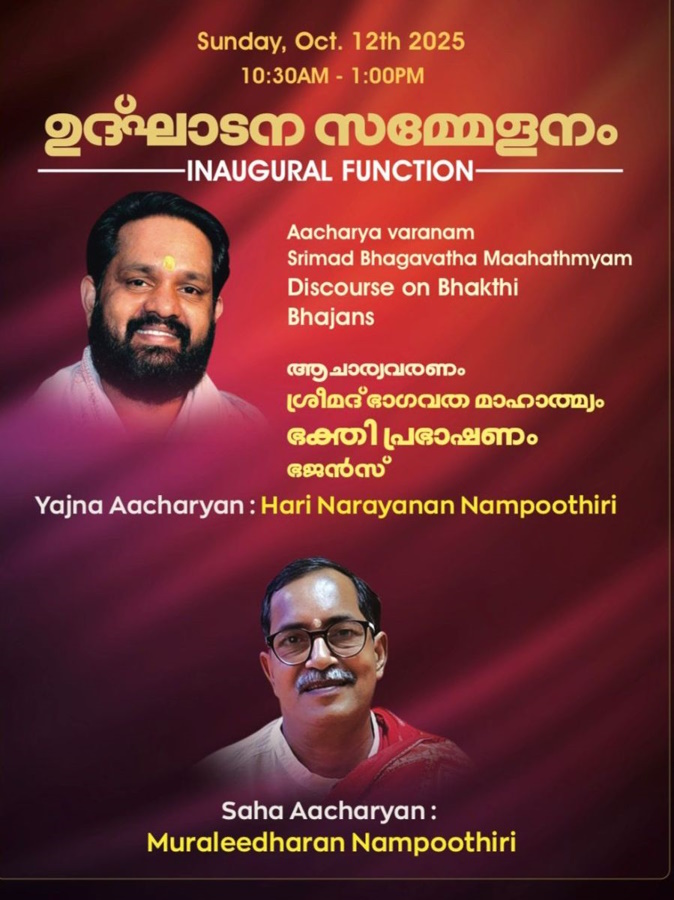 ഹ്യൂസ്റ്റണ്: ശ്രീ ഗുരുവായൂരപ്പൻ ക്ഷേത്രത്തിന്റെ ആഭിമുഖ്യത്തിൽ ഭക്തജനങ്ങളുടെ അഭിലാഷം അനുസരിച്ചു ഈ വർഷം ഒക്ടോബർ 12 മുതൽ 19 വരെ (1201 കന്നി 26 മുതൽ തുലാം 3 വരെ) ശ്രീമത് ഭാഗവത സപ്താഹയജഞം ഭഗവാന്റെ തിരുനടയിൽ നടത്തപ്പെടുകയാണ്.