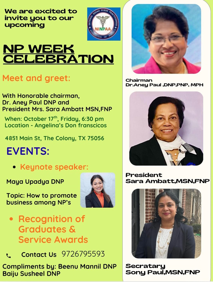 ഡലാസ്:നാഷണൽ ഇന്ത്യൻ നേഴ്സ് പ്രാക്ടീഷണർ അസോസിയേഷൻ ഓഫ് അമേരിക്കയുടെ നേതൃത്വത്തിൽ നേഴ്സ് പ്രാക്ടീഷണേഴ്സ് വീക്ക് ഡലാസിൽ ആഘോഷിക്കുന്നു. ഈ പരിപാടി ഒക്ടോബർ 17, വെള്ളിയാഴ്ച വൈകിട്ട് 6:30 മുതൽ **Angelina’s Don Franscicios, 4851 Main St, The Colony, TX 75056** എന്ന സ്ഥലത്ത് നടക്കും.