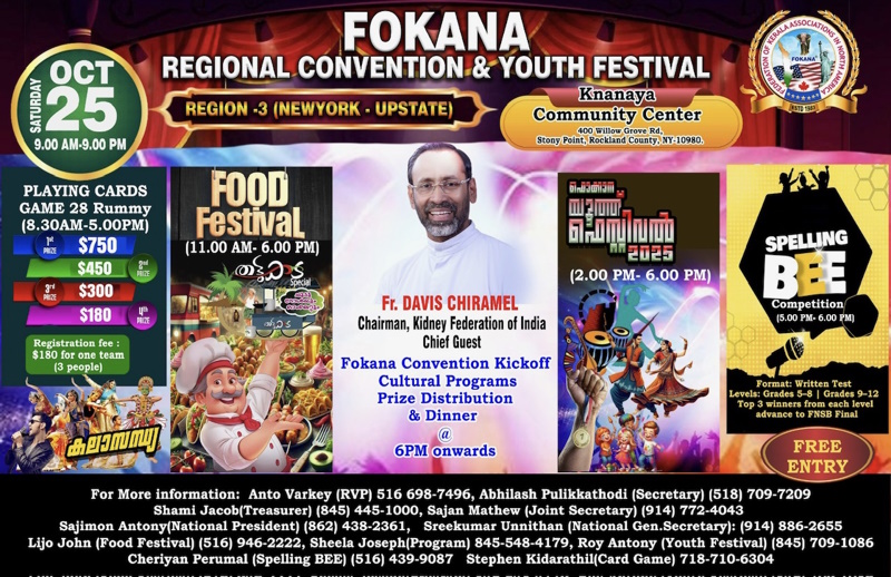 ന്യൂ യോർക്ക്: 2025 ഒക്ടോബർ 25, ശനിയാഴ്ച റോക്കലാൻഡ് കൗണ്ടിയിലെ ക്നാനായ കമ്മ്യൂണിറ്റി സെന്ററിൽ വെച്ച് (400 Willow Grove Road, Stoney Point , Rockland County) നടത്തുന്ന ഫൊക്കാനാ ന്യൂയോർക്ക് അപ്പ്സ്റ്റേറ്റ് റീജിയണൽ കൺവെൻഷന്റെ ഫ്ലയര് കൊല്ലം എം.പി എൻ.കെ. പ്രേമചന്ദ്രൻ, റാന്നി എം.എൽ.എ. പ്രമോദ് നാരായൺ, മാധ്യമ പ്രവർത്തകരായ ജോണി ലൂക്കോസ് (മലയാള മനോരമ ), ലീൻ ജസ്മാസ് (ചാനൽ 18) , മോത്തി രാജേഷ് (മാത്രുഭൂമി ചാനൽ ) എന്നിവർ ചേർന്ന് നിർവഹിച്ചു.