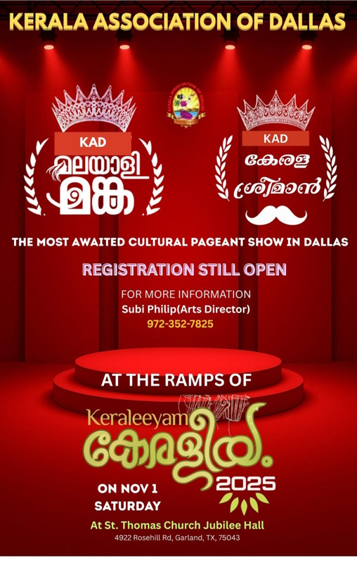 ഡാളസ് : ഡാളസ് കേരള അസോസിയേഷൻ സംഘടിപ്പിക്കുന്ന 2025 കെരളപ്പിറവി ആഘോഷം നവംബർ 1ന് വൈകിട്ട് 6 മണിക്ക് സെന്റ് തോമസ് സീറോ മലബാർ ജൂബിലി ഹാളിൽ വച്ച് നടത്തുമെന്ന് കേരള അസോസിയേഷൻ ഭാരവാഹികൾ അറിയിച്ചു