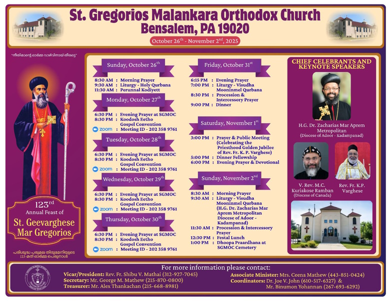 ബെൻസേലം സെന്റ് ഗ്രീഗോറിയോസ് പള്ളി പെരുന്നാൾ സെപ്റ്റംബർ 31, നവംബർ 1, 2, (വെള്ളി, ശനി, ഞായർ) തീയ്യതികളിൽ