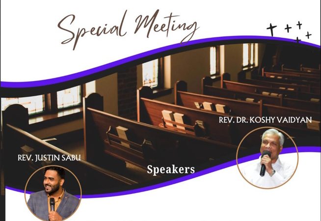 ഡാളസ്: അസംബ്ലീസ് ഓഫ് ഗോഡ് ഇന്ത്യ ഫെലോഷിപ്പ് ഓഫ് ഡാളസിൻ്റെ ആഭിമുഖ്യത്തിൽ ഒരു ഏകദിന സ്പെഷ്യൽ മീറ്റിംഗ് നവംബർ 8 ശനിയാഴ്ച രാവിലെ 10 മണി മുതൽ കരോൾട്ടണിൽ ഉള്ള ട്രൂ ലൈഫ് അസംബ്ലി ഓഫ് ഗോഡ് (2405 E. Beltline Road, Carrollton, TX 75006) സഭാ മന്ദിരത്തിൽ വെച്ച് നടക്കുന്നതാണ്. പാസ്റ്റർ ജെസ്റ്റിൻ സാബു, ഡോ. കോശി വൈദ്യൻ എന്നിവർ തിരുവചന പ്രഭാഷണം നടത്തും. ഈ ആത്മിക കൂടി വരവിലേക്ക് ഏവരേയും ഹൃദയപൂർവ്വം സ്വാഗതം ചെയ്യുന്നതായി സംഘാടകർ അറിയിച്ചു.