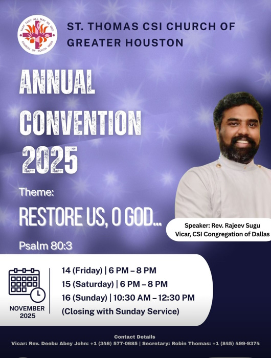 ഹൂസ്റ്റൺ: ഗ്രേറ്റർ ഹൂസ്റ്റൺ സെന്റ് തോമസ് സി.എസ്.ഐ. ചർച്ച് 2025 ലെ വാർഷിക കൺവെൻഷൻ നവംബർ 14 മുതൽ 16 വരെ നടത്തുന്നു. “Restore Us, O God…” (Psalm 80:3) എന്നതാണ് ഈ വർഷത്തെ കൺവെൻഷന്റെ തീം.