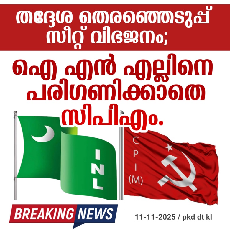 പാലക്കാട്; തദ്ദേശ തെരഞ്ഞെടുപ്പ്ൽ പാലക്കാട് ജില്ലയിൽ ഐ എൻ എൽ ആവശ്യപ്പെട്ട വാർഡ്, ഡിവിഷൻ, ബ്ലോക്ക് സീറ്റുകൾ ഇടത് മുന്നണിയിൽ ധാരണയായില്ല. മുന്നണിയിൽ കാര്യമായ ഒരു പരിഗണനയും ലഭിക്കാത്ത സാഹചര്യത്തിൽ ജില്ലയിൽ തെരെഞ്ഞെടുപ്പ് പ്രവർത്തനങ്ങളിൽ നിന്ന് വിട്ട് നിൽക്കാനും വിജയ സാധ്യതയുള്ള സീറ്റുകളിൽ സ്വതന്ത്രമായി സ്വന്തം സ്ഥാനാർഥികളെ നിർത്തി മത്സരിപ്പിക്കാനും ഐ എൻ എൽ ജില്ലാ എക്സിക്യൂട്ടീവ് യോഗത്തിൽ തീരുമാനമായതായി അറിയുന്നു.