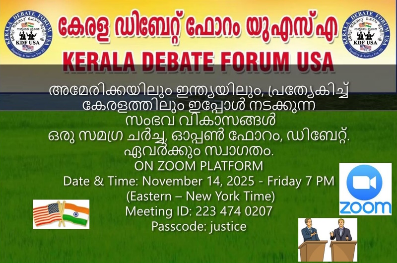 ഹ്യൂസ്റ്റൻ: അമേരിക്കയിലെയും ഇന്ത്യയിലെയും പ്രത്യേകിച്ച് കേരളത്തിലെ ഇപ്പോഴത്തെ രാഷ്ട്രീയ സാമൂഹ്യ സാംസ്കാരിക മണ്ഡലങ്ങളിലെ സംഭവ വികാസങ്ങളെ ആസ്പദമാക്കി – കേരള ഡിബേറ്റ് ഫോറം യുഎസ്എ, ഒരു സമഗ്ര ചർച്ചാ സമ്മേളനം, സംവാദം സൂം (ZOOM) ഫ്ലാറ്റ് ഫോമിൽ നവംബർ 14, 2025 – 7 PM (Eastern Time) സംഘടിപ്പിക്കുന്നു.