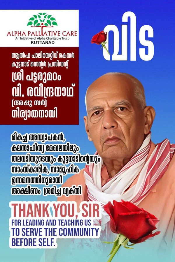 എടത്വ: ഗുരുശ്രേഷ്ഠൻ തലവടി പട്ടരുമഠം പി.വി രവീന്ദ്രനാഥിന് (അപ്പുസാർ -89) ശിഷ്യ ഗണങ്ങളുടെ യാത്രാ മൊഴി. മൃതദേഹം വ്യാഴാഴ്ച രാവിലെ വീട്ടിലും തുടർന്ന് ഉച്ചയ്ക്ക് ഒരു മണി വരെ തലവടി ആൽഫാ പാലിയേറ്റിവ് കെയർ സെൻ്ററിലും പൊതുദർശനത്തിന് വെച്ചു. രാഷ്ട്രീയ, സാമൂഹിക, സാംസ്കാരിക, സന്നദ്ധ സംഘടന രംഗത്തെ പ്രമുഖര് പ്രണാമം അർപ്പിച്ചു. വൈകിട്ട് 3 മണിക്ക് തിരുവല്ല വൈദ്യുതി പൊതു ശ്മശാനത്തിൽ സംസ്കരിച്ചു.