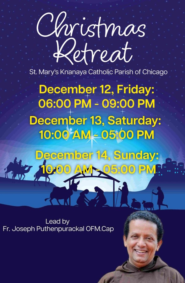 ചിക്കാഗോ: ചിക്കാഗോ സെന്റ് മേരീസ് ക്നാനായ കത്തോലിക്കാ ഇടവകയിൽ ക്രിസ്തുമസിനൊരുക്കമായുള്ള ധ്യാനത്തിന് പ്രശസ്ത വാഗ്മിയും കപ്പൂച്ചിൻ സഭാംഗവുമായ ഫാ. ജോസഫ് പുത്തൻപുരക്കൽ നേതൃത്വം നൽകും.