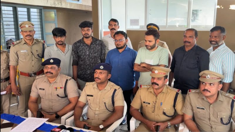 തിരൂർ മീനടത്തൂരിലെ ധനീഷ് ധർമനാണ് (38) സംഘത്തലവന്‍. പൊന്നാനി നരിപറമ്പിൽ ഇർഷാദ് (39); തിരൂർ പുറത്തൂർ സ്വദേശി രാഹുൽ (30), പയ്യനങ്ങാടിയിലെ അബ്ദുൾ നിസാർ (31), തിരുവനന്തപുരം നെടുമങ്ങാട് സ്വദേശികളായ ജസീം, രതീഷ് (37), ഷഫീഖ് (37), തമിഴ്നാട് സ്വദേശികളായ ജമാലുദ്ദീൻ (40), അരവിന്ദ് കുമാർ (24), വെങ്കിടേഷ് (24) എന്നിവരാണ് പിടിയിലായത്.
