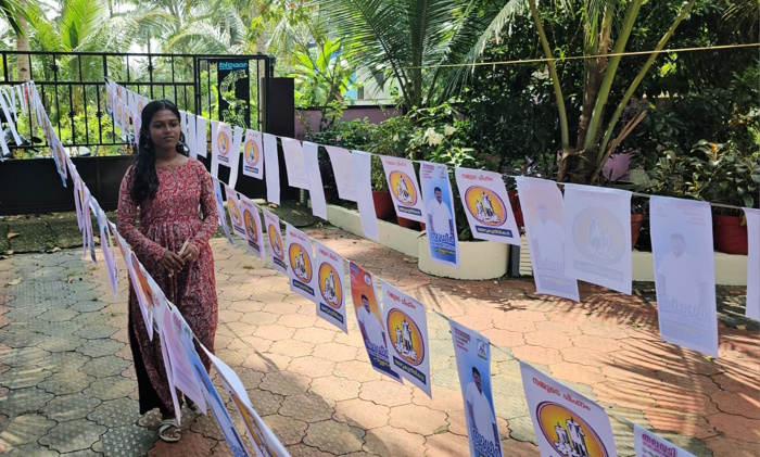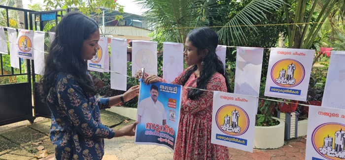 തെരഞ്ഞെടുപ്പ് പ്രചാരണത്തിന്റെ ഭാഗമായി ചിഹ്നമായ മെഴുകുതിരികൾ കൈകളിലേന്തി മകൾ ആര്യമോൾ സുധീർ വീടുകൾ കയറി വോട്ട് തേടി.