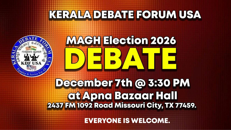 സ്റ്റാഫോർഡ്: മലയാളി അസോസിയേഷൻ ഓഫ് ഗ്രേറ്റർ ഹൂസ്റ്റൺ (MAGH) 2026-27 ഭരണസമിതി തെരഞ്ഞെടുപ്പിന് മുന്നോടിയായി കേരള ഡിബേറ്റ് ഫോറം യുഎസ്എ സംഘടിപ്പിച്ച ‘ഓപ്പൺ ഫോറം ആൻഡ് ഡിബേറ്റ്’ ജനപങ്കാളിത്തം കൊണ്ടും ഗൌരവമേറിയ ചർച്ചകൾ കൊണ്ടും ശ്രദ്ധേയമായി. ഡിസംബർ 7 ഞായറാഴ്ച വൈകുന്നേരം സ്റ്റാഫോർഡിലെ അപ്നാ ബസാറിൽ വെച്ച് നടന്ന പരിപാടിയിൽ ‘ടീം യുണൈറ്റഡ്’ തങ്ങളുടെ വികസന രേഖകളും നിലപാടുകളും വ്യക്തമാക്കിയപ്പോൾ, എതിർ പാനലായ ‘ടീം ഹാർമണി’ പരിപാടിയിൽ നിന്നും വിട്ടുനിന്നു.