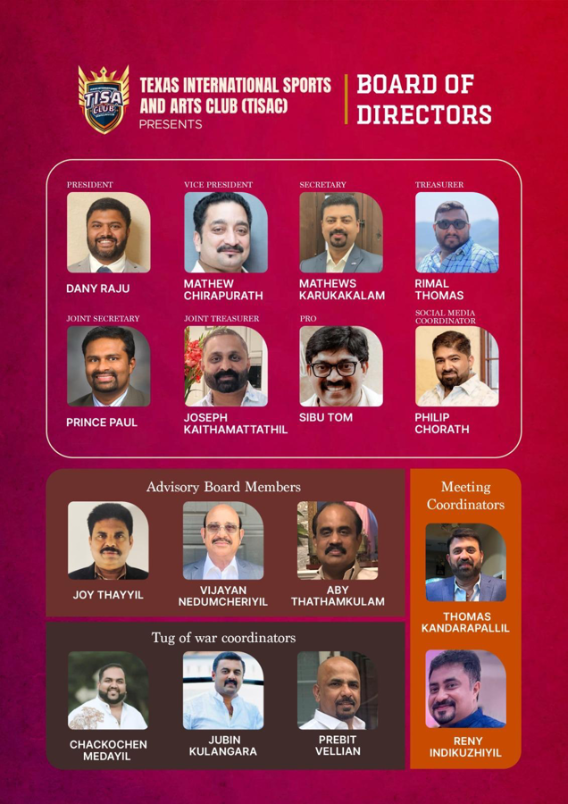 ഹൂസ്റ്റൺ – സംഘാടക മികവ് കൊണ്ടും ജന പങ്കാളിത്തം കൊണ്ടും ജന ശ്രദ്ധയാകർഷിച്ച അന്താരാഷ്ട്ര വടംവലിയും വൈവിധ്യവും വ്യത്യസ്തവുമായ മത്സരങ്ങൾ കൊണ്ട് ശ്രദ്ധയാകർഷിച്ച മൈൻഡ് & മൂവ്സ് ടൂർണമെന്റും സംഘടിപ്പിച്ച് അമേരിക്കയിലെ പ്രമുഖ മലയാളി സംഘടനകളുടെ നിരയിലേക്ക് ഉയർന്ന ടെക്സാസ് ഇന്റർനാഷണൽ സ്പോർട്സ് ആൻഡ് ആർട്സ് ക്ലബിനെ (TISAC) 2006 ൽ നയിക്കാൻ ശക്തമായ നേതൃനിരയെ തിരഞ്ഞെടുത്തു.