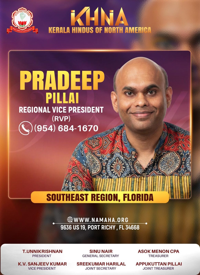 ഫ്ലോറിഡ: നോർത്ത് അമേരിക്കയിലെ മലയാളി ഹിന്ദുക്കളുടെ കേന്ദ്ര സംഘടനയായ കെ.എച്ച്.എൻ.എ (KHNA) യുടെ ഫ്ലോറിഡ റീജിയണൽ വൈസ് പ്രസിഡന്റായി (RVP) സൗത്ത് ഫ്ലോറിഡയിൽ നിന്നുള്ള പ്രദീപ് പിള്ളയെ നാമനിർദേശം ചെയ്തു. സാങ്കേതിക രംഗത്തെ മികവും സാമൂഹിക സേവന രംഗത്തെ പ്രതിബദ്ധതയും കണക്കിലെടുത്താണ് സംഘടനയുടെ ഈ തീരുമാനം.