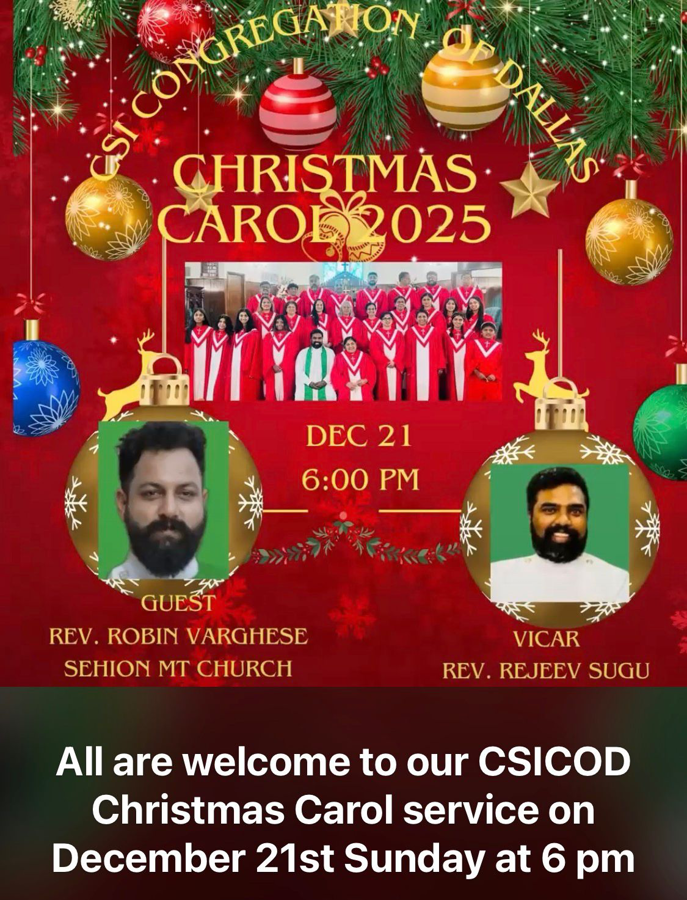 ഡാളസ്: സി.എസ്.ഐ കോൺഗ്രിഗേഷൻ ഓഫ് ഡാളസിന്റെ ഈ വർഷത്തെ ക്രിസ്മസ് കരോൾ സർവീസ് ഡിസംബർ 21 ഞായറാഴ്ച വൈകുന്നേരം 6 മണിക്ക് നടക്കും. ‘ക്രിസ്മസ് കരോൾ 2025’ എന്ന് പേരിട്ടിരിക്കുന്ന ഈ ശുശ്രൂഷയിൽ വൈവിധ്യമാർന്ന കരോൾ ഗാനങ്ങളും ക്രിസ്മസ് സന്ദേശവും ഉണ്ടായിരിക്കും.