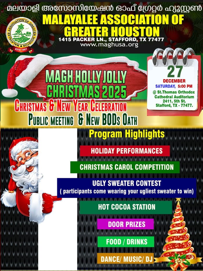 ഹൂസ്റ്റൺ: മലയാളി അസോസിയേഷൻ ഓഫ് ഗ്രേറ്റർ ഹൂസ്റ്റൺ ക്രിസ്മസ് ന്യൂ ഇയർ ആഘോഷവും 2026 ലേക്ക് ഉള്ള ഭരണസമിതിയുടെ സത്യപ്രതിജ്ഞ ചടങ്ങും ഡിസംബർ 27 ശനിയാഴ്ച വൈകുന്നേരം അഞ്ചുമണിക്ക് സ്റ്റാഫോർഡ് സെന്റ് തോമസ് ഓർത്തഡോക്സ് കത്തീഡ്രൽ ഹാളിൽ നടക്കും. തദവസരത്തിൽ മലയാളികളായ മേയർമാരും ജഡ്ജിമാരും വിവിധ മതസാമുദായിക സംഘടന പ്രമുഖരും പങ്കെടുക്കും. ക്രിസ്മസ് കരോൾഗാന മത്സരവും സംഘടിപ്പിക്കുന്നുണ്ട്. ഒന്നും രണ്ടും മൂന്നും സ്ഥാനം ലഭിക്കുന്നവർക്ക് ക്യാഷ് അവാർഡും ട്രോഫികളും സമ്മാനിക്കും. വിവിധ കലാവിരുന്നുകളും ഒരുക്കിയിട്ടുണ്ട്. പങ്കെടുക്കുന്ന എല്ലാവർക്കും രുചികരമായ ക്രിസ്മസ് ഡിന്നറും ഉണ്ടായിരിക്കും. വിവിധ കലാപരിപാടികളും അരങ്ങേറും.