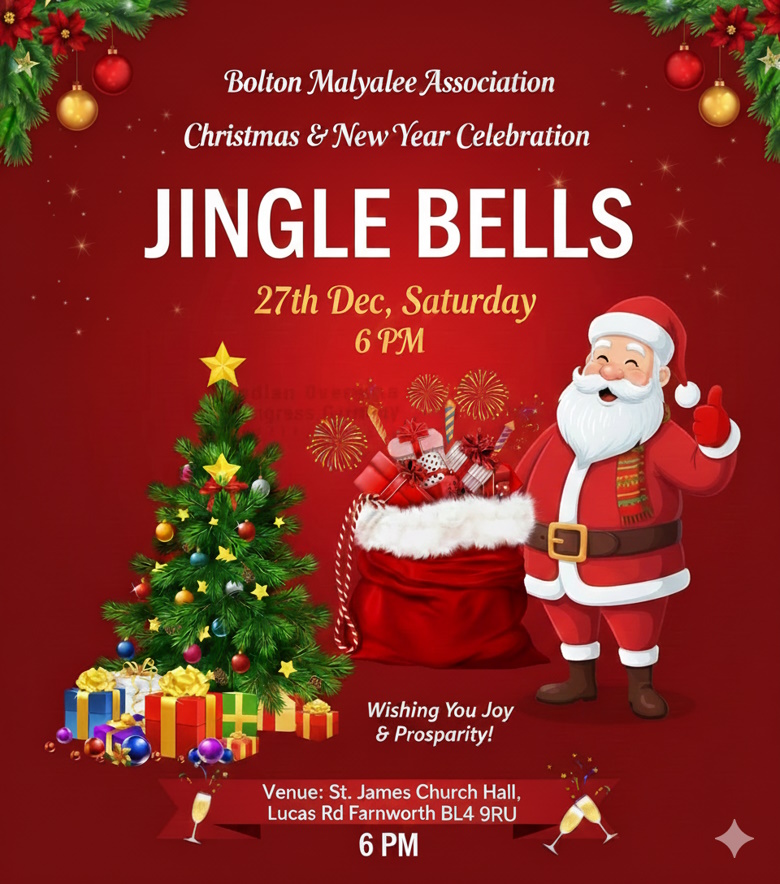 ബി എം എയുടെ ക്രിസ്മസ് – പുതുവത്സര ആഘോഷങ്ങൾ ‘ജിംഗിൾ ബെൽസ്’ ഡിസംബർ 27 ശനിയാഴ്ച ഫാൻവർത്ത് സെന്റ്. ജയിംസ് ചർച്ച് ഹാളിൽ വച്ചു വൈവിധ്യമാർന്ന പരിപാടികളോടെ സംഘടിപ്പിക്കും. വൈകിട്ട് 6 മണിയോടെ ആഘോഷപരിപാടികളുടെ തിരി തെളിയും.