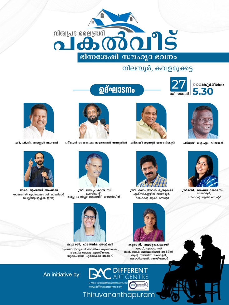 ഡിഫറന്റ് ആര്‍ട് സെന്ററിന്റെ നേതൃത്വത്തില്‍ സംസ്ഥാനത്തെ എല്ലാ ജില്ലകളിലും നിര്‍മ്മിച്ചു നല്‍കുന്ന മാജിക് ഹോം ഭവന പദ്ധതിയുടെ തുടര്‍ച്ചയായാണ് ഇത്തരമൊരു പകല്‍വീട് വിശ്വപ്രഭ ലൈബ്രറിക്കുവേണ്ടി നിര്‍മിച്ചു നല്‍കുന്നത്. അബ്ദുള്‍ വഹാബ് എം.പി, കവിയും ഗാനരചയിതാവുമായ കൈതപ്രം ദാമോദരന്‍ നമ്പൂതിരി, ചെണ്ട വിദ്വാന്‍ മട്ടന്നൂര്‍ ശങ്കരന്‍കുട്ടി, കായികതാരം ഐ.എം വിജയന്‍ എന്നിവര്‍ ചേര്‍ന്ന് താക്കോല്‍ദാനം നിര്‍വഹിക്കും.