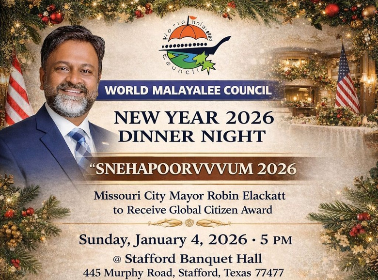 ഹൂസ്റ്റൺ, ടെക്സാസ്: വേൾഡ് മലയാളി കൗൺസിൽ (WMC) “സ്നേഹപൂർവ്വം 2026” എന്ന പേരിൽ പുതുവത്സര 2026 ഡിന്നർ നൈറ്റ് 2026 ജനുവരി 4-ന് (ഞായർ) വൈകിട്ട് 5:00 മണിക്ക് ടെക്സാസിലെ സ്റ്റാഫോർഡിലുള്ള സ്റ്റാഫോർഡ് ബാങ്ക്വറ്റ് ഹാളിൽ സംഘടിപ്പിക്കുന്നു.