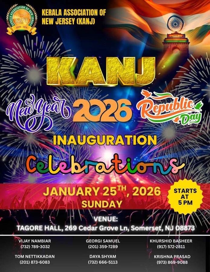 2026 ജനുവരി 26th ന് ടാഗോർ ഹാളിൽ നടക്കുന്ന വിജയ് നമ്പ്യാരുടെ നേതൃത്വത്തിലുള്ള കമ്മറ്റിയുടെ പ്രവർത്തനോദ്ഘാടനവും ന്യൂയർ – റിപ്പബ്ലിക്ക് ആഘോഷങ്ങളിലേക്കും എല്ലാവരെയും ഹാർദ്ദവമായി സ്വാഗതം ചെയ്യുന്നു, – https://www.kanj.org/event-details/kanj-new-year-celebrations