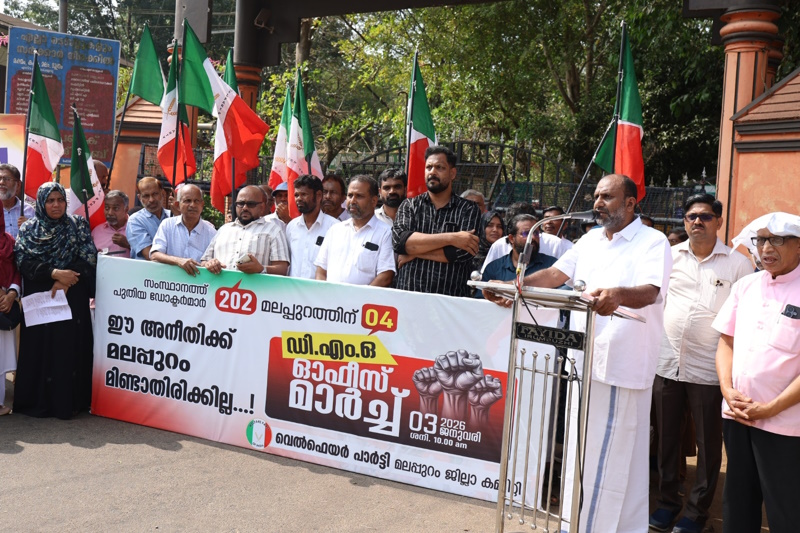 മലപ്പുറം : 48 ലക്ഷത്തിലധികം ജനങ്ങൾ ജീവിക്കുന്ന മലപ്പുറത്ത് പുതിയ ജില്ലകൾ എന്നത് നീതി മാത്രമാണെന്ന് വെൽഫെയർ പാർട്ടി ജില്ലാ പ്രസിഡൻ്റ് കെ.വി സഫീർഷ അഭിപ്രായപ്പെട്ടു . സംസ്ഥാന സർക്കാരിൻ്റെ ഡോക്ടർമാരുടെ നിയമനത്തിൽ മലപ്പുറത്തോട് കാണിച്ച അനീതിയിൽ പ്രതിഷേധിച്ച് വെൽഫെയർ പാർട്ടി ജില്ലാ കമ്മറ്റി സംഘടിപ്പിച്ച ഡി എം ഒ ഓഫീസ് മാർച്ച് ഉദ്ഘാടനം ചെയ്ത് സംസാരിക്കുകയായിരുന്നു അദ്ദേഹം.