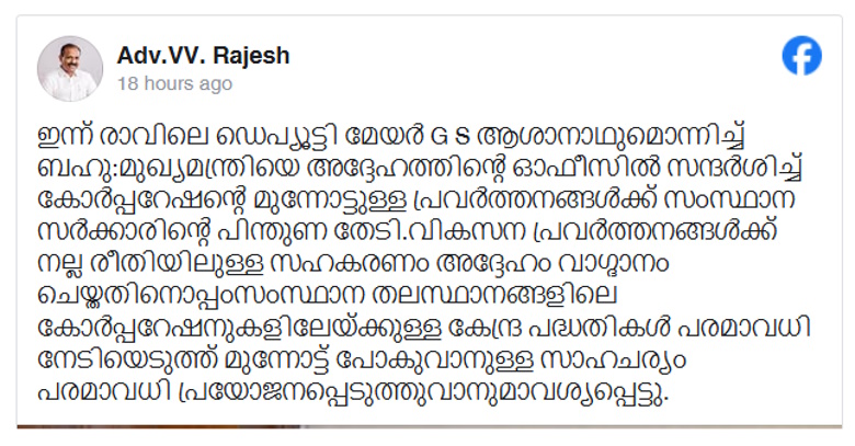 വികസന പ്രവർത്തനങ്ങൾക്ക് നല്ല സഹകരണം വാഗ്ദാനം ചെയ്ത മുഖ്യമന്ത്രി, സംസ്ഥാന തലസ്ഥാനത്ത് കോർപ്പറേഷനു വേണ്ടിയുള്ള കേന്ദ്ര പദ്ധതികൾ പരമാവധി പ്രയോജനപ്പെടുത്താൻ കോർപ്പറേഷനോട് ആവശ്യപ്പെട്ടതായി രാജേഷ് പറഞ്ഞു.