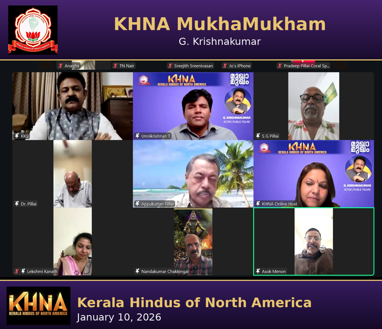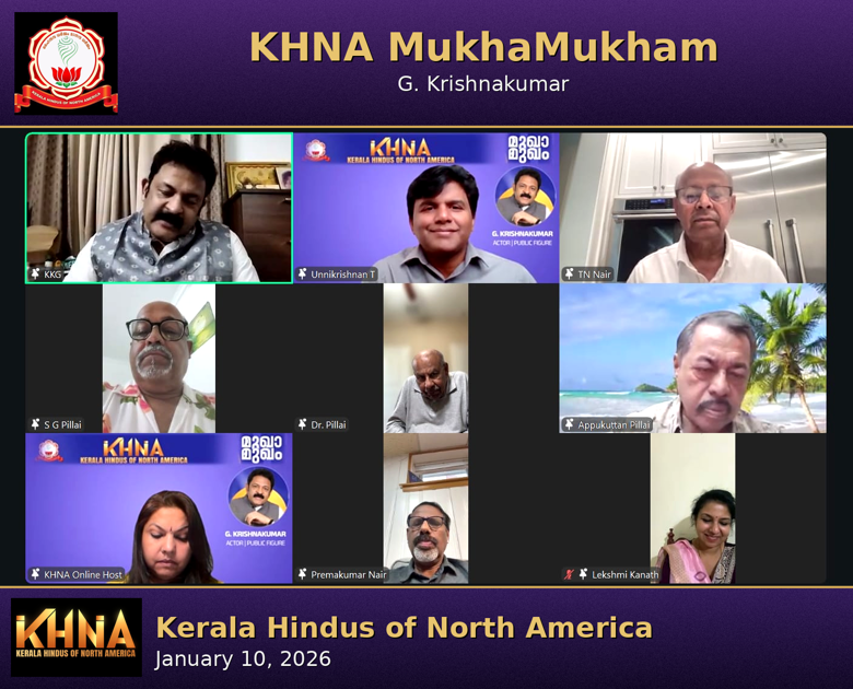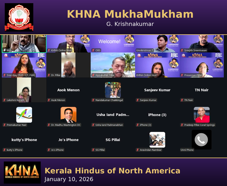 കേരള ഹിന്ദൂസ് ഓഫ് നോർത്ത് അമേരിക്ക (KHNA) സംഘടിപ്പിച്ച “മുഖാമുഖം” പരിപാടി 2026 ജനുവരി 10-ന് ഫേസ്ബുക്ക് ലൈവ് മുഖേന നടന്നു. അമേരിക്കയിലുടനീളമുള്ള അംഗങ്ങളുടെ വിപുലമായ പങ്കാളിത്തത്തോടെ നടന്ന പരിപാടി ആത്മീയതയും സാമൂഹിക ബോധവൽക്കരണവും ചേർന്ന ഒരു അർത്ഥവത്തായ വേദിയായി മാറി.