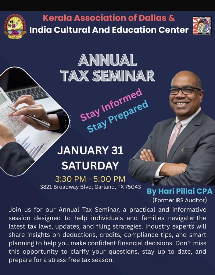 കേരള അസോസിയേഷൻ ഓഫ് ഡാളസും ഇന്ത്യ കൾച്ചറൽ ആൻഡ് എഡ്യൂക്കേഷൻ സെന്ററും സംയുക്തമായി സംഘടിപ്പിക്കുന്ന വാർഷിക ടാക്സ് സെമിനാർ ജനുവരി 31 ശനിയാഴ്ച നടക്കും. പുതിയ നികുതി നിയമങ്ങൾ, ഫയലിംഗ് രീതികൾ എന്നിവയെക്കുറിച്ച് വ്യക്തികൾക്കും കുടുംബങ്ങൾക്കും വ്യക്തമായ ധാരണ നൽകുന്നതിനായാണ് ഈ സെമിനാർ സംഘടിപ്പിക്കുന്നത്.