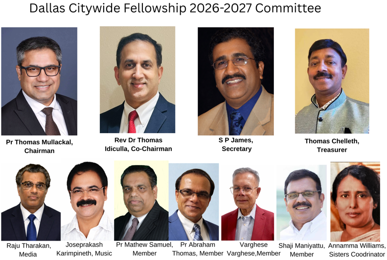 ഡാളസ്: ഡാളസ് പട്ടണത്തിലെ മലയാളി പെന്തക്കോസ്തൽ സഭകളുടെ ഐക്യവേദിയായ ഡാളസ് സിറ്റി-വൈഡ് ഫെലോഷിപ്പിന്റെ ചെയർമാനായി പാസ്റ്റർ തോമസ് മുല്ലയ്ക്കലും കോ-ചെയർമാനായി ഡോ. തോമസ് ഇടിക്കുളയും സെക്രട്ടറിയായി എസ് പി ജെയിംസും ട്രെഷററായി തോമസ് ചെല്ലേത്തും തിരഞ്ഞെടുക്കപ്പെട്ടു. ഇക്കഴിഞ്ഞ നവംബർ 15-ന് ഡാളസിൽ കൂടിയ പൊതുയോഗത്തിൽ വച്ചാണ് 2026-2027 വർഷത്തേക്കുള്ള പുതിയ ഭാരവാഹികളെ തിരഞ്ഞെടുത്തത്. കഴിഞ്ഞ എട്ടു വർഷങ്ങളിലായി സിറ്റി-വൈഡ് ഫെലോഷിപ്പിന് നേതൃത്വം നൽകിയ പാസ്റ്റർ മാത്യു ശാമുവലിന്റെ പ്രവർത്തനങ്ങളെ യോഗം അനുസ്മരിക്കുകയുണ്ടായി.