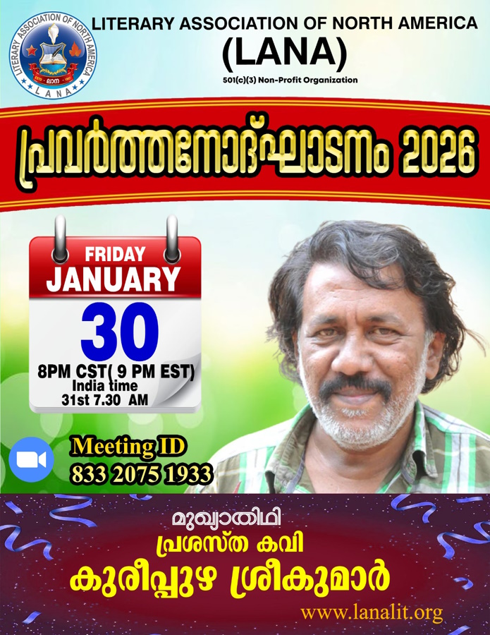 ഡാളസ് : ലിറ്റററി അസോസിയേഷൻ ഓഫ് നോർത്ത് അമേരിക്ക (ലാന) യുടെ 2026 വർഷത്തെ പ്രവർത്തന ഉദ്ഘാടനം ജനുവരി 30 ന് വൈകിട്ട് 8 മണിക്ക് (8PM CST / 9 PM EST, ഇന്ത്യൻ സമയം ജനുവരി 31, 7.30 AM ) നടത്തപ്പെടുന്നതാണ്. പ്രശസ്ത കവി കുരീപ്പുഴ ശ്രീകുമാർ ഉദ്ഘാടനം ചെയ്യുന്നു. ലാന അംഗങ്ങളായ, സുകുമാർ കാനഡ, Dr. എൽസ നീലിമ മാത്യു, ശ്രീമതി ഉഷ നായർ, ശ്രീമതി ബിന്ദു ടിജി എന്നിവരുടെ കാവ്യാലാപനം ഈ ചടങ്ങിൽ അവതരിപ്പിക്കും. അമേരിക്കയിലെയും, കാനഡയിലെയും വിവിധ നഗരങ്ങളിലെ ലാന അംഗങ്ങളുടെ സൗകര്യം കണക്കിലെടുത്ത് സൂം മീറ്റിംഗ് വഴിയാണ് ഉദ്ഘാടനം ക്രമീകരിച്ചിരിക്കുന്നത്. പുതുമയാർന്ന നിരവധി പ്രോഗ്രാമുകളാണ് ഈ വർഷം ലാന വിഭാവനം ചെയ്തിരിക്കുന്നതെന്നും അവയെ ഏകോപിപ്പിച്ചു നടത്തുന്നതിനായി ലാനാ പ്രോഗ്രാം കമ്മറ്റിക്ക് രൂപം നൽകിയിട്ടുണ്ടെന്നും ലാനാ പ്രസിഡന്റ് സാമൂവേൽ യോഹന്നാൻ അറിയിച്ചു.
