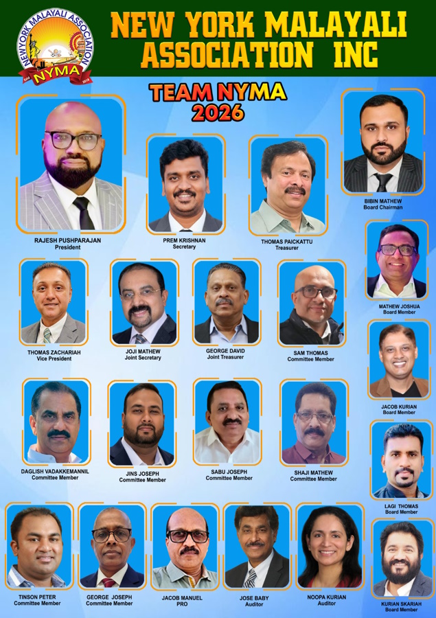 ന്യൂയോർക്ക്: അമേരിക്കയിലെ മലയാളി സംഘടനകളിൽ സജീവ സാന്നിധ്യമായ ന്യൂയോർക്ക് മലയാളി അസോസിയേഷൻ്റെ (NYMA) 2026 പ്രവർത്തന വർഷത്തേക്കുള്ള പുതിയ ഭാരവാഹികളെ തിരഞ്ഞെടുത്തു.