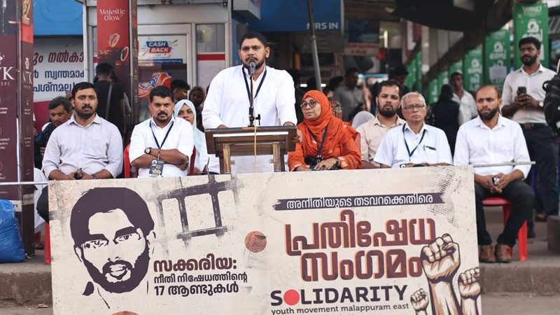 മഞ്ചേരി: ബംഗളൂരു സ്ഫോടനക്കേസിൽ പ്രതിചേർക്കപ്പെട്ട് വിചാരണത്തടവുകാരനായി ജയിലിൽ കഴിയുന്ന സക്കരിയയുടെ നീതി നിഷേധത്തിന് 17 വർഷം തികയുന്ന സാഹചര്യത്തിൽ, ‘അനീതിയുടെ തടവറക്കെതിരെ’ എന്ന മുദ്രാവാക്യമുയർത്തി സോളിഡാരിറ്റി യൂത്ത് മൂവ്മെന്റ് മലപ്പുറം ഈസ്റ്റ് ജില്ലാ കമ്മിറ്റി പ്രതിഷേധ സംഗമം സംഘടിപ്പിച്ചു. മഞ്ചേരി പുതിയ ബസ് സ്റ്റാൻഡ് പരിസരത്ത് നടന്ന സംഗമം സോളിഡാരിറ്റി സംസ്ഥാന പ്രസിഡന്റ് തൗഫീഖ് മമ്പാട് ഉദ്ഘാടനം ചെയ്തു.