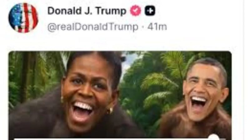 ബരാക് ഒബാമയുടെയും മിഷേൽ ഒബാമയുടെയും തലകള് കുരങ്ങുകളുടെ ശരീരത്തിൽ സൂപ്പർഇമ്പോസ് ചെയ്തിരിക്കുന്ന ഒരു മിനിറ്റ് ദൈർഘ്യമുള്ള വീഡിയോ വ്യാഴാഴ്ച രാത്രിയാണ് ട്രംപ് പങ്കിട്ടത്. 2020 ലെ യുഎസ് പ്രസിഡന്റ് തിരഞ്ഞെടുപ്പിൽ കൃത്രിമം കാണിക്കാൻ ഡൊമിനിയൻ വോട്ടിംഗ് സിസ്റ്റംസ് സഹായിച്ചുവെന്ന അടിസ്ഥാനരഹിതമായ വാദം വീഡിയോയിൽ ആവർത്തിച്ചു.