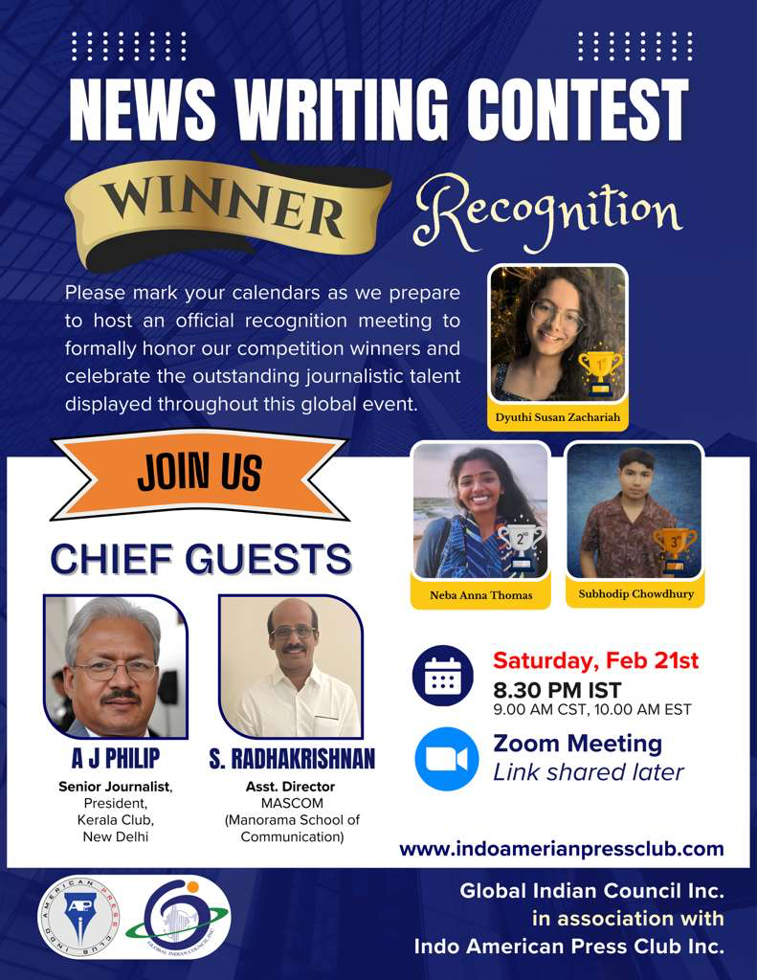 ഡാളസ്: ഇൻഡോ അമേരിക്കൻ പ്രസ് ക്ലബ്ബും (IAPC) ഗ്ലോബൽ ഇന്ത്യൻ കൗൺസിലും (GIC) സംയുക്തമായി സംഘടിപ്പിച്ച ഓൺലൈൻ അന്താരാഷ്ട്ര വാർത്താ രചനാ മത്സരത്തിലെ വിജയികളെ ആദരിക്കുന്നു. ഫെബ്രുവരി 21 ശനിയാഴ്ച ഇന്ത്യൻ സമയം രാത്രി 8.30-ന് (9.00 AM CST) സൂം പ്ലാറ്റ്ഫോമിൽ നടക്കുന്ന വെർച്വൽ യോഗത്തിൽ വെച്ചാണ് അവാർഡുകൾ പ്രഖ്യാപിക്കുന്നതും വിജയികളെ ആദരിക്കുന്നതും.