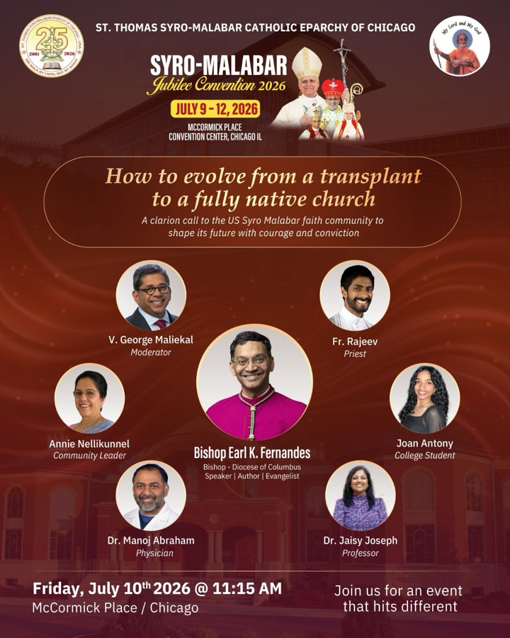 ചിക്കാഗോ സീറോ മലബാർ രൂപതയുടെ രജതജൂബിലി കൺവെൻഷനിൽ മുഖ്യപ്രഭാഷണം നടത്തുന്നതിനായി കൊളംബസ് രൂപതയുടെ മെത്രാനായ ബിഷപ്പ് ഏൾ കെ. ഫെർണാണ്ടസ് എത്തിച്ചേരുന്നു. അമേരിക്കയിലെ ഒരു ലാറ്റിൻ കത്തോലിക്കാ രൂപതയുടെ അധ്യക്ഷനാകുന്ന ആദ്യ ഇന്ത്യൻ വംശജനെന്ന ചരിത്ര നേട്ടം കൈവരിച്ച വ്യക്തിയായ അദ്ദേഹം, കുടിയേറ്റസഭയായി ആരംഭിച്ച വിശ്വാസസമൂഹം അമേരിക്കൻ മണ്ണിൽ തദ്ദേശീയ സഭയായി വളരേണ്ട ദിശകളെക്കുറിച്ചുള്ള തന്റെ ചിന്തകൾ പങ്കുവെക്കും.