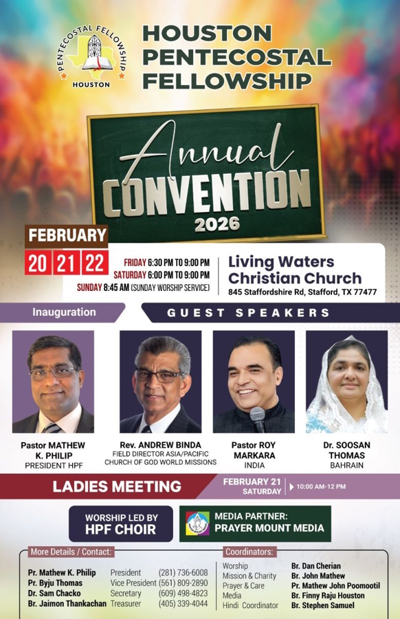 ഹ്യൂസ്റ്റൺ: ഹ്യൂസ്റ്റൺ പെന്തക്കോസ്തൽ ഫെലോഷിപ്പ് (HPF) സംഘടിപ്പിക്കുന്ന വാർഷിക കൺവെൻഷൻ 2026 ഫെബ്രുവരി 20, 21, 22 തീയതികളിൽ സ്റ്റാഫോർഡിലുള്ള Living Waters Christian Church ൽ (845 Staffordshire Rd, Stafford, TX 77477) നടക്കും.
