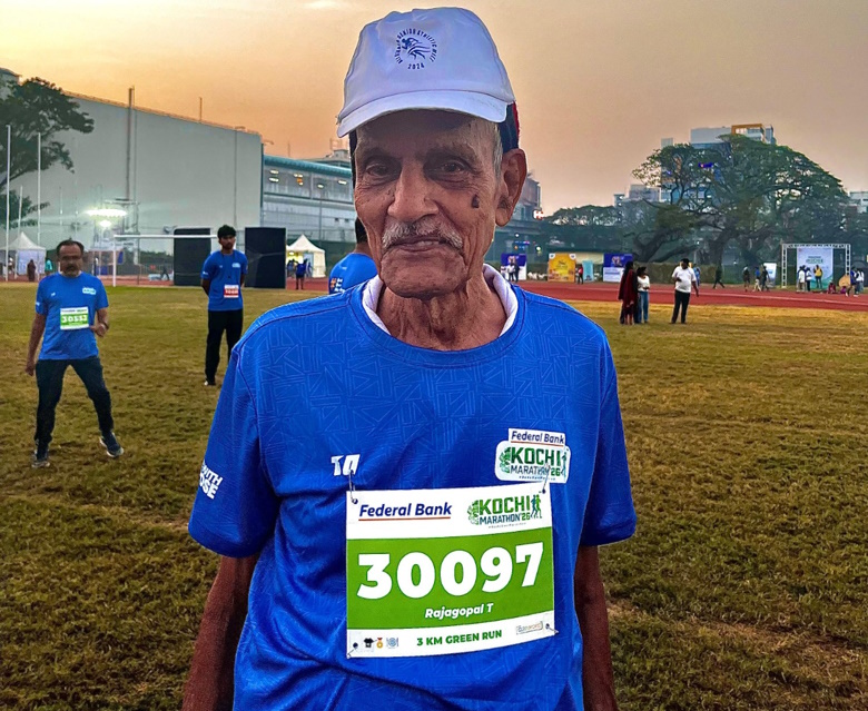 കൊച്ചി: പ്രായം വെറുമൊരു അക്കമാണെന്ന് വീണ്ടും തെളിയിക്കുകയാണ് 93 വയസുകാരനായ ടി രാജഗോപാൽ. കൊച്ചി മാരത്തോണിന്റെ ട്രാക്കിൽ ആവേശമായി മാറിയ ഈ പാലക്കാട് സ്വദേശി, തന്റെ തൊണ്ണൂറ്റിമൂന്നാം വയസിലും മൂന്ന് കി.മി മാരത്തോൺ പൂർത്തിയാക്കിയാണ് കാണികളെ വിസ്മയിപ്പിച്ചത്. വിവിധ മാരത്തോണുകളിൽ മുൻപും പങ്കെടുത്തിട്ടുണ്ടെങ്കിലും കൊച്ചി മാരത്തോണിൽ രാജഗോപാലിന്റെ ആദ്യത്തെ അങ്കമാണിത്.