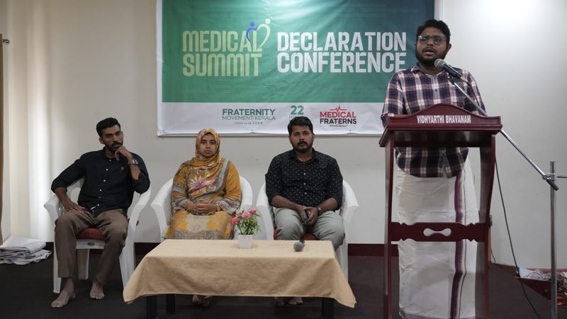 മെഡിക്കൽ ഫ്രറ്റേൺസ് ഏപ്രിൽ 26 ന് സംഘടിപ്പിക്കുന്ന മെഡിക്കൽ സമ്മിറ്റിൻ്റെ പ്രഖ്യാപനം ഫ്രറ്റേണിറ്റി മൂവ്മെൻ്റ് സംസ്ഥാന പ്രസിഡൻ്റ് നഈം ഗഫൂർ നിർവഹിക്കുന്നു