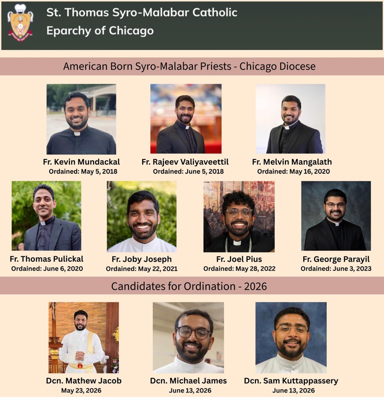 വളർച്ചയുടെ പാതയിൽ സിൽവർ ജൂബിലി ഒരു നാഴിക കല്ലാണെങ്കിലും, ഒരു രൂപതയുടെ പ്രയാണത്തിൽ ഇരുപത്തഞ്ചു വർഷങ്ങൾ വലിയൊരു അളവുകോലല്ല. എന്നാൽ ഈ ചെറിയ കാലയളവിൽ ഷിക്കാഗോ രൂപത കൈവരിച്ച ആത്മീയവും ഭൗതികവുമായ വളർച്ചക്കൊപ്പം, രൂപതയിലുണ്ടായിട്ടുള്ള ദൈവവിളികളും എടുത്തു പറയേണ്ടതാണ്. സ്വർഗ്ഗീയനായ ജോൺ പോൾ രണ്ടാമൻ മാർപ്പാപ്പയാൽ, 2001ൽ സ്ഥാപിതമായ ഷിക്കാഗോ സിറോ മലബാർ രൂപതക്ക്, ഈ ചുരുങ്ങിയ കാലയളവിൽ, തദ്ദേശ്യരായ പത്തോളം വൈദികർക്ക് ജൻമം നൽകുവാൻ സാധിച്ചത്, തീവ്രമായ പ്രാർത്ഥനയുടേയും, ചിട്ടയായ മതബോധനത്തിന്റേയും ഫലമാണ്. കൂടാതെ നിലവിൽ എഴിൽപ്പരം യുവജനങ്ങൾ വിവിധ സെമിനാരികളിൽ പഠിക്കുന്നുയെന്നതും ഷിക്കാഗോ രൂപതയുടെ ശോഭനമായ ദൈവവിളിയെയാണ് പ്രതിഫലിപ്പിക്കുന്നത്. അമേരിക്കയിൽ സ്ഥിര താമസമാക്കിയ മാതാപിതാക്കളുടെ രണ്ടാം തലമുറകളിൽ നിന്നും, എല്ലാവിധ പ്രലോഭനങ്ങളേയും, വെല്ലുവിളികളേയും അതിജീവിച്ചുകൊണ്ട്, അനസ്യൂതം ഉണ്ടായിക്കൊണ്ടിരിക്കുന്ന ദൈവവിളികൾ, അനന്തമായ ദൈവപരിപാനയുടെ നേർസാക്ഷ്യമാണ്!