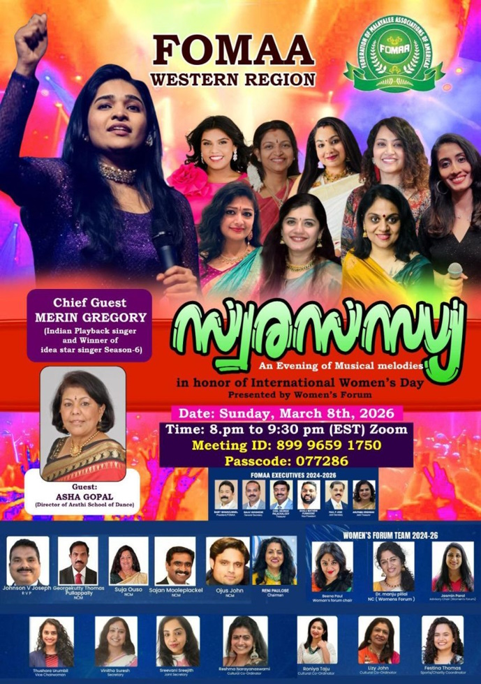 കാലിഫോർണിയ: ദൈനംദിന ജീവിതത്തിന്റെ മാനസിക പിരിമുറുക്കത്തിൽ നിന്നും അല്പം മാറിനിന്ന് കുറച്ച് ശുദ്ധസംഗീതത്തിന്റെ സ്വരമാധുരിക്കൊപ്പം കാതോർത്തിരിക്കാൻ, അന്താരാഷ്ട്ര വനിതാ ദിനത്തിൽ ഫോമാ വെസ്റ്റേൺ റീജിയന്റെ വുമൺസ് ഫോറത്തിന്റെ നേതൃത്വത്തിൽ നിങ്ങൾക്കായി “സ്വരസന്ധ്യ – സംഗീത സായാഹ്നം” അവസരമൊരുക്കുന്നു. മാർച്ച് മാസം എട്ടാം തീയതി ഞായറാഴ്ച വൈകിട്ട് എട്ട് മണി – EST(അഞ്ച് മണി – PST) മുതൽ ആരംഭിക്കുന്ന സ്വരസന്ധ്യ സംഗീത സായാഹ്നത്തിൽ പങ്കെടുക്കുന്നതിനായി ഏവരെയും ക്ഷണിക്കുന്നതായി R.V.P ജോൺസൺ ജോസഫ് വ്യക്തമാക്കി. അലയലയായി ഒഴുകിയെത്തുന്ന ശ്രുതി ചേർന്ന ഹൃദ്യമായ സ്വരമാധുരി നിങ്ങൾക്കായി ആലപിക്കുന്നത് നമ്മൾക്കേറ്റവും പ്രീയപ്പെട്ട പ്രശസ്ത ഗായികയും, ഐഡിയ സ്റ്റാർ സിംഗർ സീസൺ-6 വിജയിയുമായ മെറിൻ ഗ്രിഗറിയും, മറ്റു അമേരിക്കൻ മലയാളി ഗായികമാരുമാണ്.