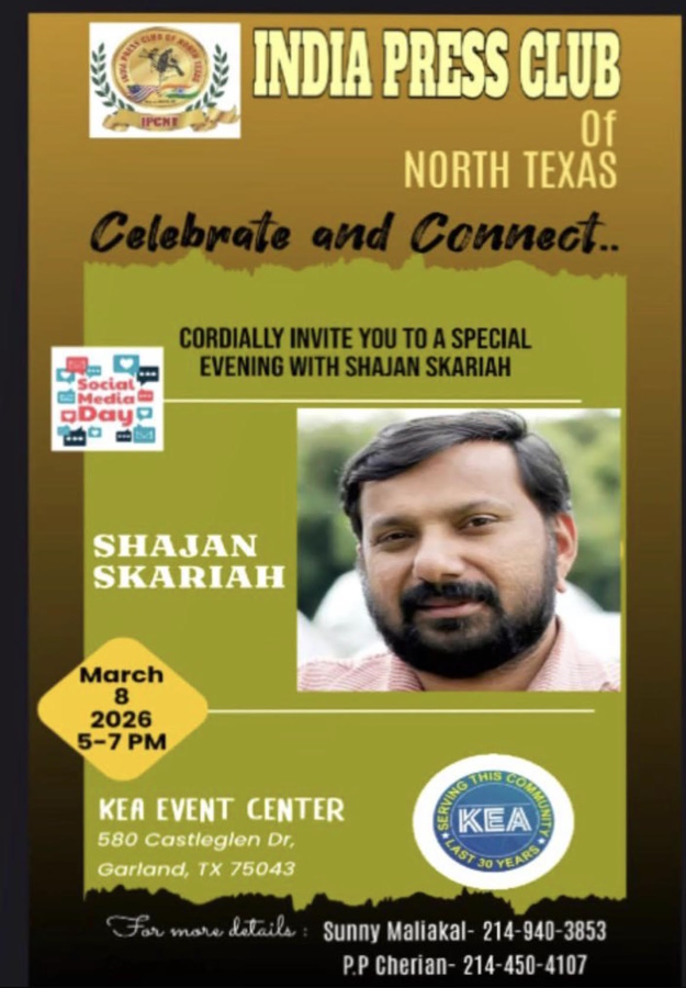 ഇന്ത്യ പ്രസ് ക്ലബ് ഓഫ്നോർത്ത് ടെക്സസ് ഷാജൻ സ്കറിയയുമായി പ്രത്യേക സംഗമം ഡാളസ്സിൽ,മാർച്ച് 8 നു