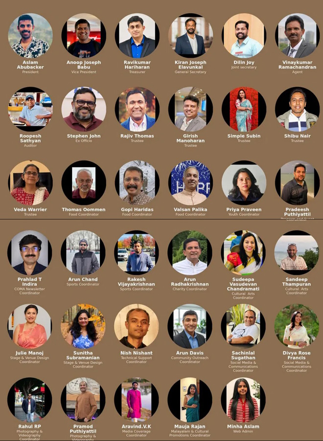 ജനറൽ കമ്മിറ്റി അംഗങ്ങളായ ഭക്ഷണ കോർഡിനേറ്റർമാരായ ഗോപി ഹരിദാസ്, തോമസ് ഉമ്മൻ, വത്സൻ പാലിക്ക; യൂത്ത് കോർഡിനേറ്റർ പ്രിയ പ്രവീൺ; പ്രോഗ്രാം & ഇവന്റ് കോർഡിനേറ്റർ പ്രദീഷ് പുതിയത്റ്റിൽ; ന്യൂസ്ലെറ്റർ കോർഡിനേറ്റർ പ്രഹ്ലാദ് ടി. ഇന്ദിര; സ്പോർട്സ് കോർഡിനേറ്റർമാരായ അരുണ് ചന്ദ്, രാകേഷ് വിജയകൃഷ്ണൻ; ചാരിറ്റി കോർഡിനേറ്റർ അരുണ് രാധാകൃഷ്ണൻ; കലാ/സാംസ്കാരിക കോർഡിനേറ്റർമാരായ സുധീപ വാസുദേവൻ ചന്ദ്രമതി, സന്ദീപ് തമ്പുരാൻ; സ്റ്റേജ് & വേദി ഡിസൈൻ: ജൂലി മനോജ്, സുനിത സുബ്രഹ്മണ്യൻ; ടെക്നിക്കൽ സപ്പോർട്ട്: നിഷ് നിശാന്ത്; കമ്മ്യൂണിറ്റി ഔട്രീച്ച്: അരുണ് ഡേവിസ്; സോഷ്യൽ മീഡിയ & കമ്മ്യൂണിക്കേഷൻസ്: സച്ചിൻലാൽ സുഗതൻ, ദിവ്യ റോസ് ഫ്രാൻസിസ്; ഫോട്ടോഗ്രഫി & വീഡിയോഗ്രഫി: രാഹുൽ ആർ.പി, പ്രമോദ് പുതിയത്റ്റിൽ; മീഡിയ കവറേജ്: അരവിന്ദ് വി.കെ; മലയാളം & സാംസ്കാരിക പ്രചാരണം: മൗജ രാജൻ; വെബ് അഡ്മിൻ: മിൻഹാ അസ്ലം എന്നിവർ സജീവമായി പ്രവർത്തിച്ചു. അവതാരകരായ അരുണ് ഡേവിസും അഞ്ജനയും വേദിയെ മനോഹരമായി നയിച്ചു.